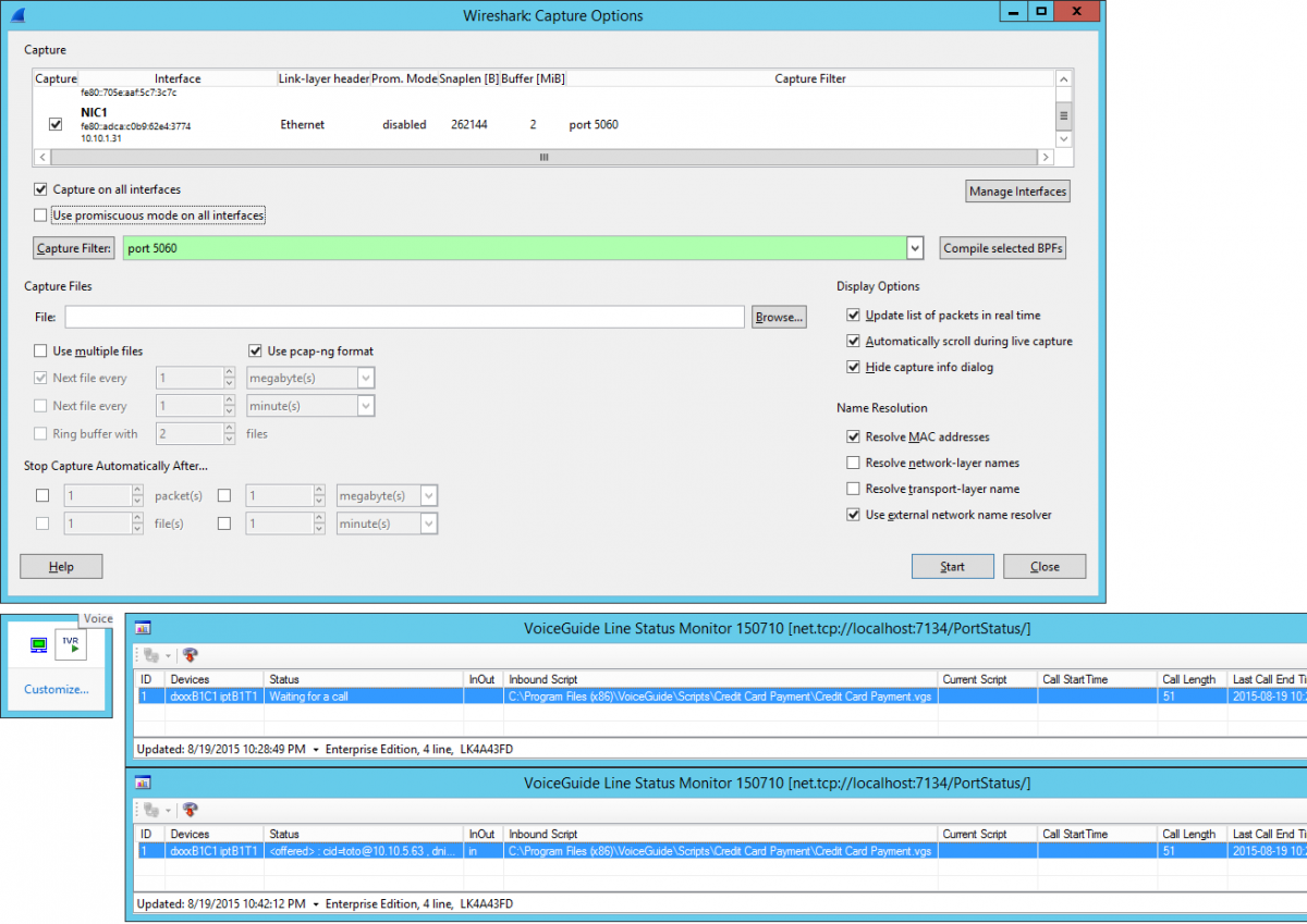 SupportTeam Report post Posted 08/21/2015 12:36 PM There is something wrong with the Dialogic 'media' device here. Was the Dialogic service restarted since the 'TCP' option was commented back out? If Dialogic service was not restarted just prior to last test then that would be the next step to try. Can you please do the following: Stop VoiceGuide service (probably best to just uninstall VoiceGuide for now) and stop IPMediaServer.exe Confirm the Windows' Firewall is turned off. Stop and Start the Dialogic service from the DCM (Dialogic Configuration Manager) Open an 'Admin' level Command Prompt Start IPMediaServer.exe in that 'Admin' level Command Prompt Make a test all into system as before (can you make it form another machine on 10.10.1.X subnet? it looks like you are making calls from 192.168.1.69 and there is at least one router in the path) Collect and .ZIP up traces as before (Wireshark and RTF) and also a screenshot of the 'Admin' level Command Prompt that is running IPMediaServer.exe taken after the call ends. Share this post Link to post