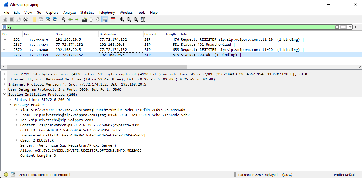 SupportTeam Report post Posted 01/13/2022 09:20 PM (edited) Looks like the WireShark capture was started a bit late as it did not capture the beginning of the registration process, but I think that we can see enough to see what the settings should be. Please try using the below as the <VoIP_Registration> section in VoiceGuide's Config.xml: <VoIP_Registration> <Protocol>SIP</Protocol> <RegServer>sip.voippro.com</RegServer> <RegClient>mivatech5@sip.voippro.com</RegClient> <LocalAlias>mivatech5@192.168.2.147</LocalAlias> <Expires>3600</Expires> </VoIP_Registration> VoiceGuide service will need to be restarted after changing the Config.xml in order for VoiceGuide to read in the new Config.xml settings. If you still encounter problems please post WireShark trace capturing registration attempt. NOTE: Please change the password used on the SIP account after posting any WireShark traces that capture SIP registrations. If password is too simple it can be cracked from the posted WireShark trace. Edited 01/13/2022 09:31 PM by SupportTeam Share this post Link to post