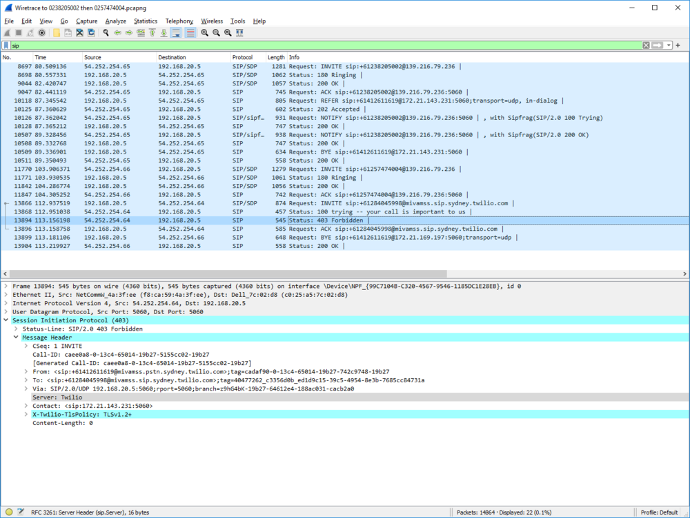 SupportTeam Report post Posted 05/10/2022 09:05 AM The outgoing leg of the 'Blind Dial and Connect' to +61284045998@mivamss.sip.sydney.twilio.com is rejected by the SIP trunk provider. The SIP Trunk Provider (Twilio) is replying with a "403 Forbidden", and the call is then dropped (see screenshot below) Usually Twilio provides error details in the "403 Forbidden" reply but looks like in this case there is no further information. Twilio offers logs to let you better see what happened on each call. Log into your Twilio account and go to: https://www.twilio.com/console/sip-trunking/logs/calls The "Trunk Terminating" direction calls are the calls from your system out to the external number. Find the problem call and click on that Calls SID link to see more details about what happened. You can also the click on the "Debug Event SID" to get more verbose information. SIP PCAP Log is also available there to let you confirm that this is the same call. If you can post a screenshot of page shown when you click the "Debug Event SID" link then we should see what the issue is. Share this post Link to post