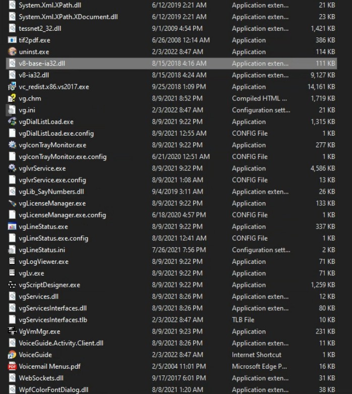 SupportTeam Report post Posted 02/02/2022 11:48 PM Some old .EXEs can still be seen in that directory. eg: How did the old vgStatusMonitor.exe from 2007 get there? (current status monitor is called vgLineStatus.exe) VoiceGuide installer creates a log file which keeps a record of how the installation progressed. That file is named installLog.txt and is in the main VoiceGuide directory (C:\Program Files (x86)\VoiceGuide). Can you please post the installLog.txt here. Regrading to why you can't see the Start menu entries - are you doing all installations at the computer (and not while remotely logged-in in some way) and when logged in as a user with Administrator privileges? Maybe try running the VoiceGuide installer "As Administrator". Right click on the installer .exe and select "Run as Administrator" from the context menu that pops up. Share this post Link to post