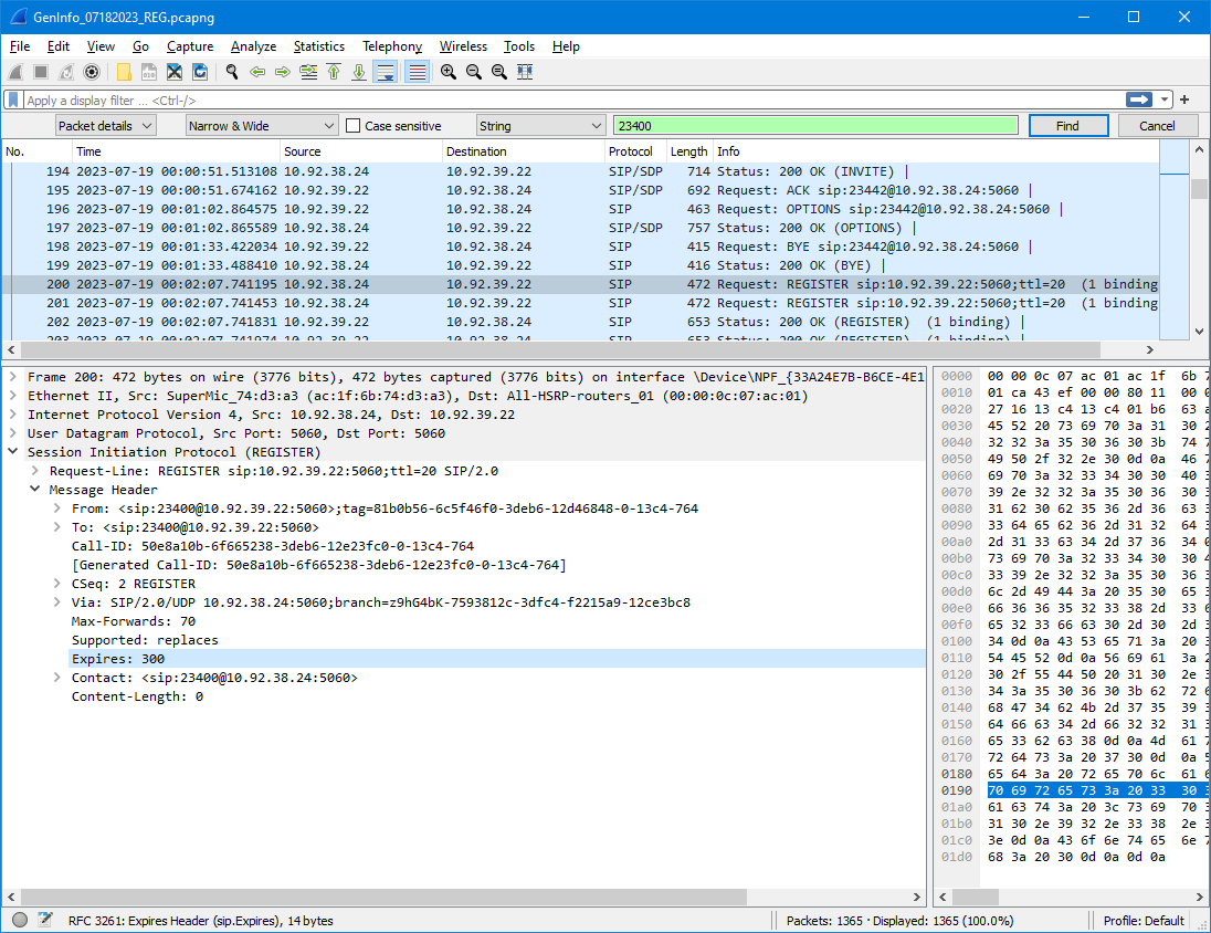 Harry C Report post Posted 07/19/2023 06:06 AM The Expires value set as 180 in config file. When VG started, Wireshark did show the register request send to PBX with Expires set as 180. But 200 OK for my request show the Expires value as 300 Before 300 second limit hit, system did send the refresh REGISTER request to PBX but Expires value already become 300 even we did setup 180 in config. We need to set our Expires value as 180. What should I do? Register.zip Share this post Link to post