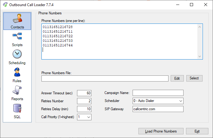 SupportTeam Report post Posted 03/01/2024 11:14 PM If loading calls using the Outbound Call Loader you can set the IP Address or Domain Name in the "SIP Gateway" text box. Each provided number and the 'SIP Gateway will be concatenated together at the time of loading into VoiceGuide's "CallQue" database table with a "@" character in between. See below screen screenshot. "SIP Gateway" text box is in bottom right: If loading outgoing calls using an "Outdial" file or other automated or API methods that do not have the option to set the SIP Gateway separately then you need to specify the IP Address or Domain Name with every number. Share this post Link to post