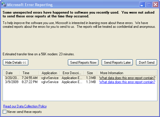 Guest u4910 Report post Posted 03/24/2009 02:42 AM Here is the error in the event log that may point to the issue...Event Type: ErrorEvent Source: .NET Runtime 2.0 Error ReportingEvent Category: NoneEvent ID: 1000Date: 3/20/2009Time: 7:20:21 AMUser: N/AComputer: EARTHDescription:Faulting application vgivrservice.exe, version 7.0.3.0, stamp 49b546c4, faulting module mscorwks.dll, version 2.0.50727.3082, stamp 492b82c1, debug? 0, fault address 0x00025155. Data:0000: 41 00 70 00 70 00 6c 00 A.p.p.l.0008: 69 00 63 00 61 00 74 00 i.c.a.t.0010: 69 00 6f 00 6e 00 20 00 i.o.n. .0018: 46 00 61 00 69 00 6c 00 F.a.i.l.0020: 75 00 72 00 65 00 20 00 u.r.e. .0028: 20 00 76 00 67 00 69 00 .v.g.i.0030: 76 00 72 00 73 00 65 00 v.r.s.e.0038: 72 00 76 00 69 00 63 00 r.v.i.c.0040: 65 00 2e 00 65 00 78 00 e...e.x.0048: 65 00 20 00 37 00 2e 00 e. .7...0050: 30 00 2e 00 33 00 2e 00 0...3...0058: 30 00 20 00 34 00 39 00 0. .4.9.0060: 62 00 35 00 34 00 36 00 b.5.4.6.0068: 63 00 34 00 20 00 69 00 c.4. .i.0070: 6e 00 20 00 6d 00 73 00 n. .m.s.0078: 63 00 6f 00 72 00 77 00 c.o.r.w.0080: 6b 00 73 00 2e 00 64 00 k.s...d.0088: 6c 00 6c 00 20 00 32 00 l.l. .2.0090: 2e 00 30 00 2e 00 35 00 ..0...5.0098: 30 00 37 00 32 00 37 00 0.7.2.7.00a0: 2e 00 33 00 30 00 38 00 ..3.0.8.00a8: 32 00 20 00 34 00 39 00 2. .4.9.00b0: 32 00 62 00 38 00 32 00 2.b.8.2.00b8: 63 00 31 00 20 00 66 00 c.1. .f.00c0: 44 00 65 00 62 00 75 00 D.e.b.u.00c8: 67 00 20 00 30 00 20 00 g. .0. .00d0: 61 00 74 00 20 00 6f 00 a.t. .o.00d8: 66 00 66 00 73 00 65 00 f.f.s.e.00e0: 74 00 20 00 30 00 30 00 t. .0.0.00e8: 30 00 32 00 35 00 31 00 0.2.5.1.00f0: 35 00 35 00 0d 00 0a 00 5.5..... Share this post Link to post