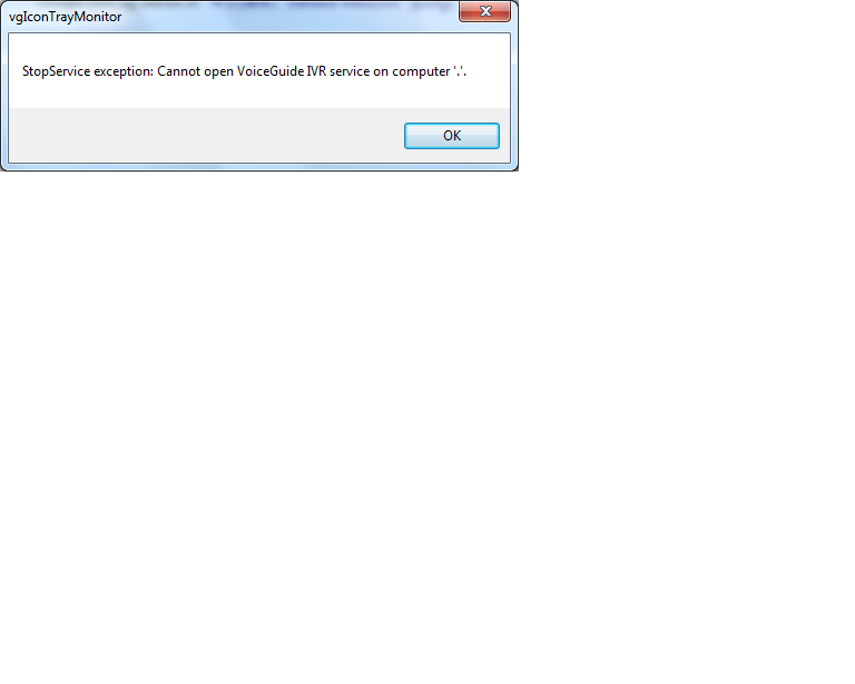 SupportTeam Report post Posted 08/11/2011 11:58 AM The error message with stopping of services will appear if the currently logged in user does not have permissions to start/stop that service. A workaround would be to start/stop the service using Control Panel -> Administratove Tools -> Services applet. Then stop/start the "VoiceGuide IVR" service. Share this post Link to post