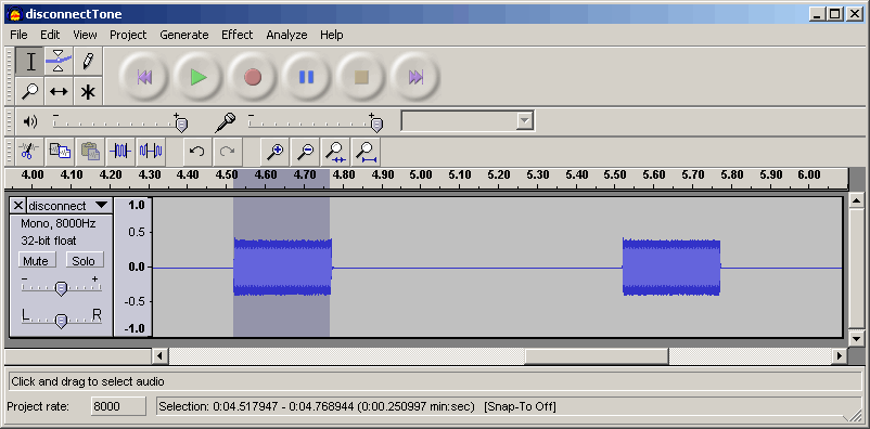 Screenshot below shows Audacity with a disconnect tone with the ON part of the disconnect tone highlighted.