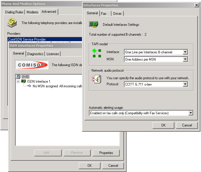 Open Start -> Settings -> Control Panel then click "Phone and Modem Options" or "Telephony", and then under "Advanced" or "Telephony Drivers", select "ComISDN Service Provider" and click "Configure".