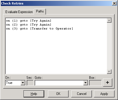 The value saved by this Evaluate Expression module is then used in the Paths section to determine the next module the script should branch to.