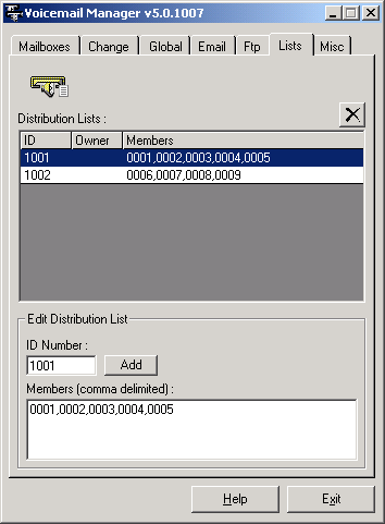 Messages recorded in the voicemail system can be sent to individual voicemail boxes or Distribution Lists. Distribution Lists are by default global and available for use to anyone. This screenshot shows how the Distribution Lists are defined: